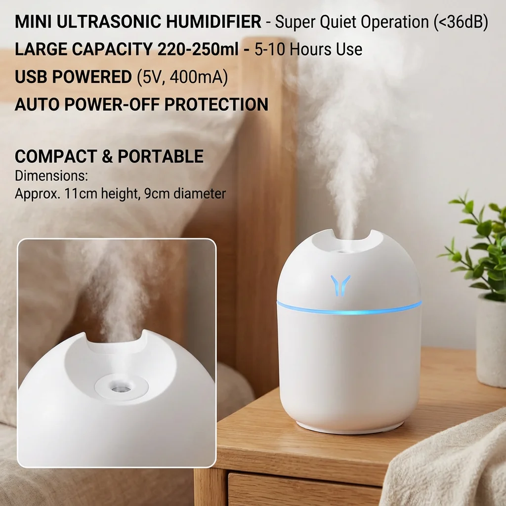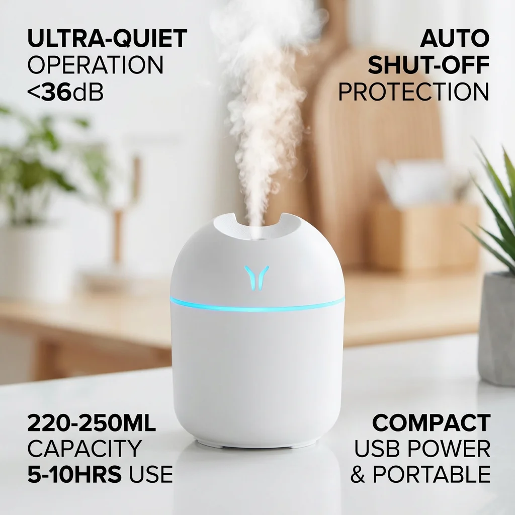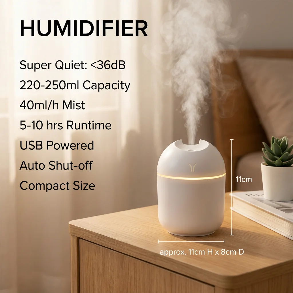Com tanque de 220–250 ml e pulverização aproximada de 40 ml/h, o difusor e umidificador de aroma usb compacto com luz noturna led oferece autonomia de 5 a 10 horas, ajudando a manter o ar mais agradável em áreas de 10–20 m². O ruído é baixo (menos de 36 dB), tornando-o uma opção discreta para dormir, estudar ou trabalhar.