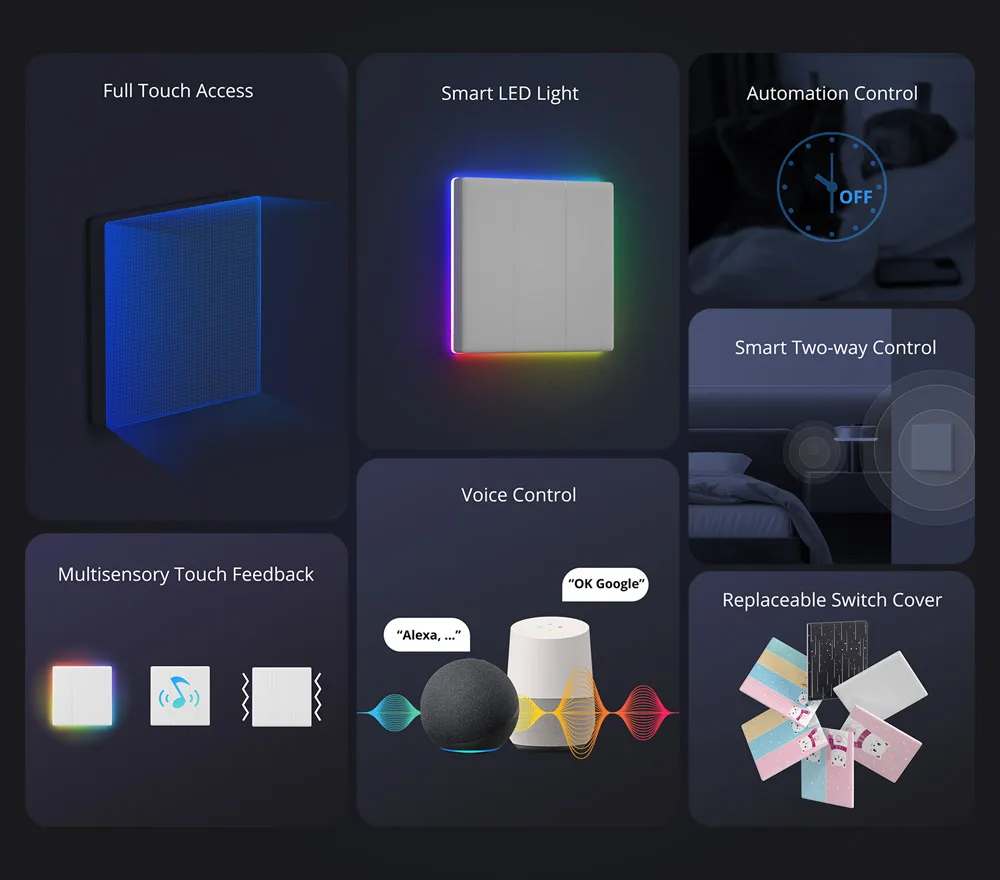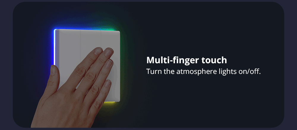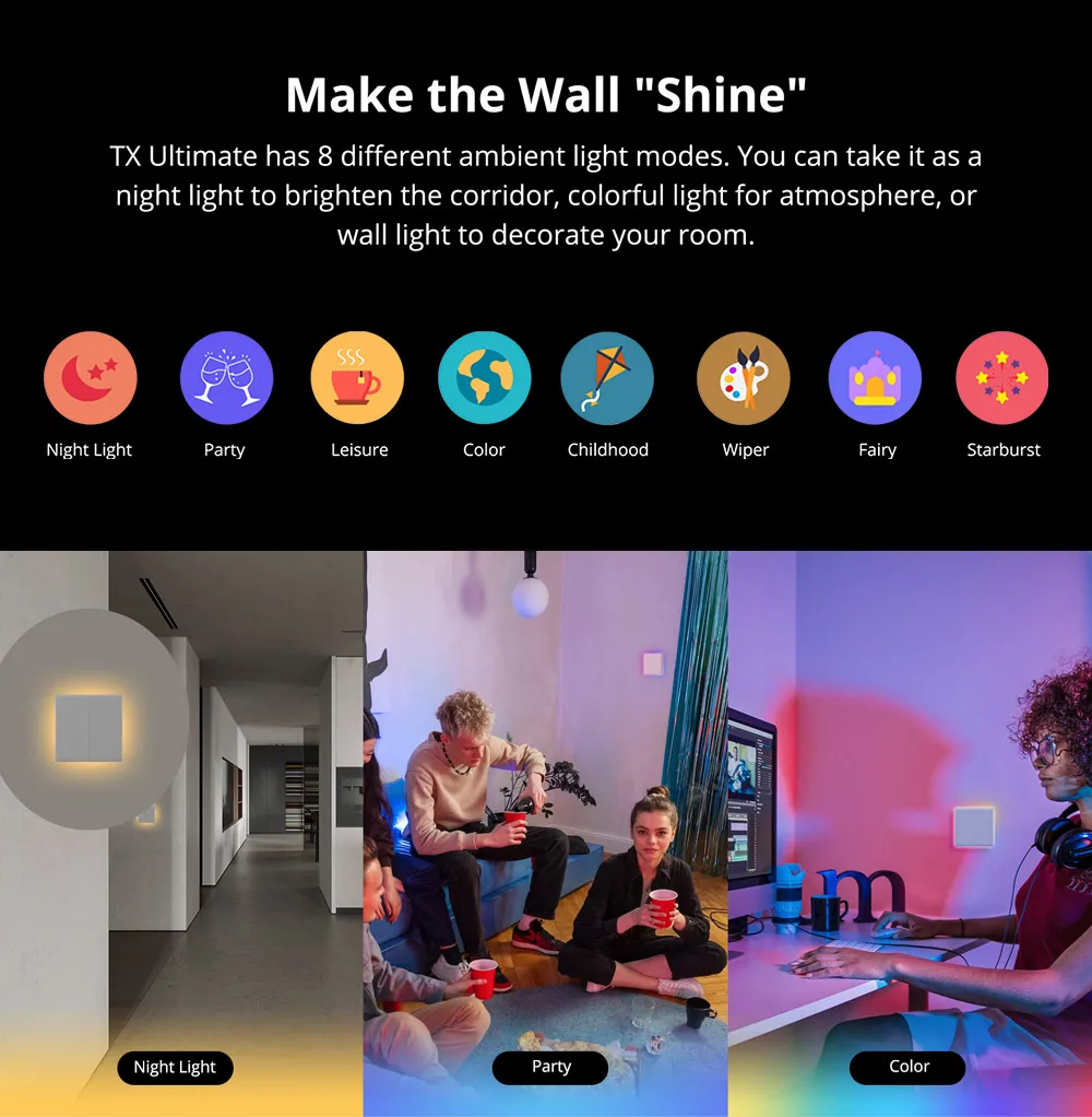 Uma das principais características do TX Ultimate é o círculo de luzes laterais LED que circundam o interruptor, possui 8 modos de luz ambiente diferentes.Você pode até usá-lo como luz noturna, usado com sensores inteligentes (como DW2-WiFi, SNZB-03), ao acordar à noite, o corredor será iluminado automaticamente.
