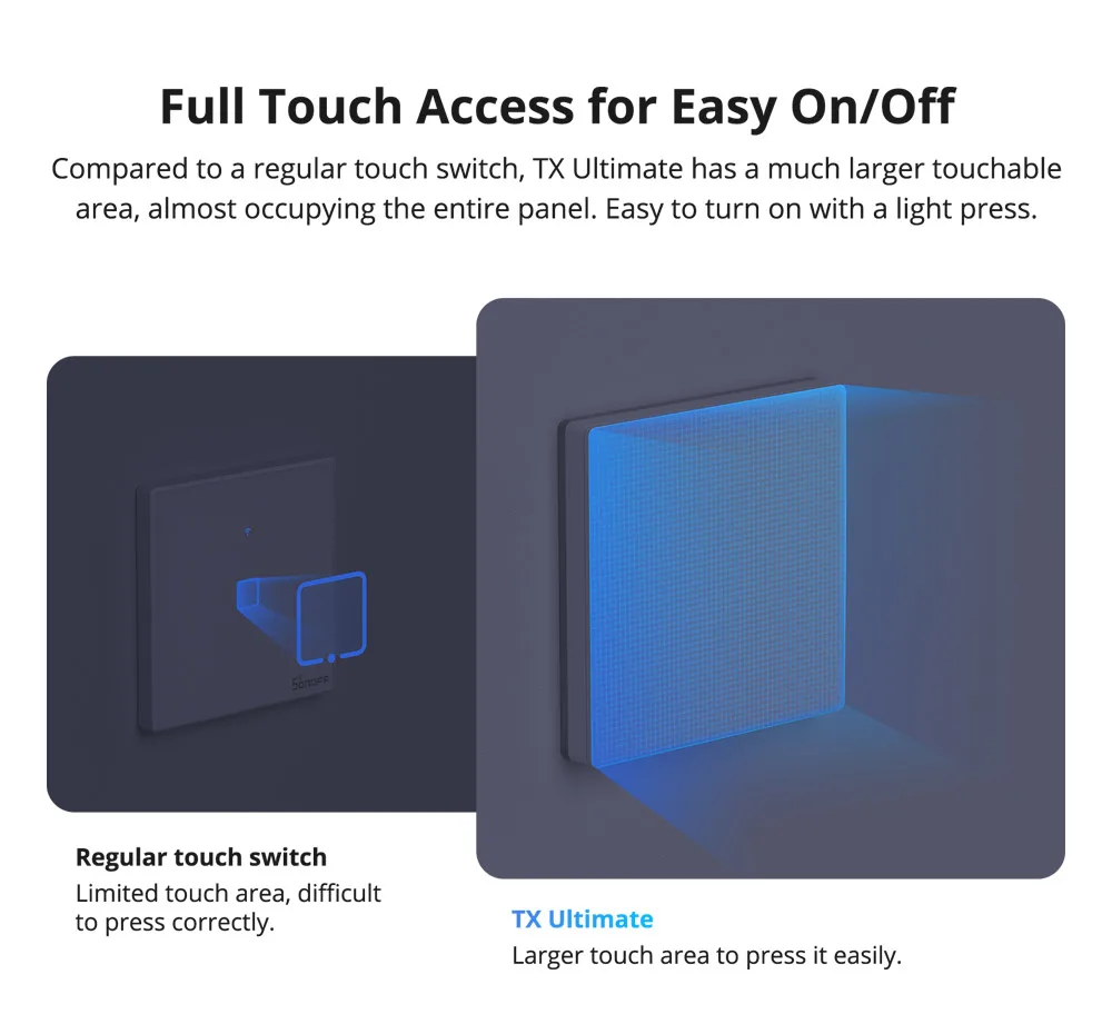 【Acesso Full Touch】Em comparação com um interruptor de toque normal, o TX Ultimate tem uma área tocável muito maior, ocupando quase todo o painel.Fácil de ligar/desligar com um leve toque.
