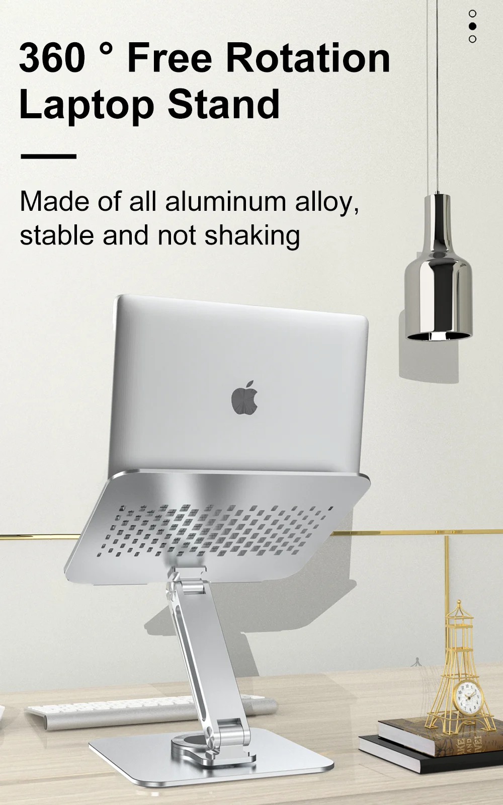 O suporte portatil para laptop em liga de aluminio rotacao 360 foi criado para melhorar a ergonomia e aumentar o conforto durante trabalho, estudo ou lazer, elevando o portátil para uma posição mais natural e reduzindo tensão no pescoço e ombros.